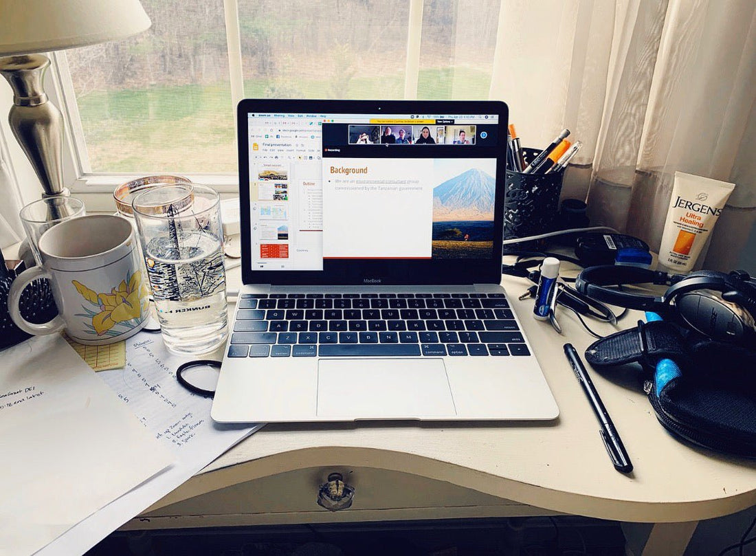 My final class was Conservation in Practice: An International Perspective. It's a small class, 11 students total. My team gave a presentation on our group project, an assessment of the proposed road bisecting the Serengeti (which, of course, would be an environmental disaster). I had two presentations the week before; I had done my makeup for them, tried to make myself presentable. This time, I couldn't be bothered. My hair was soaking wet; I had just showered after forcing myself to go for a run for the first time in weeks. My desk, invisible to everyone but me, was in complete disarray. On it were two empty tea mugs, three water glasses, a hairbrush, a hair elastic, a regular elastic, papers, coins, dental floss, clothing tags, pens, two sets of headphones, lipstick, Chapstick, Vaseline, hand cream, nail clippers, a charger, and my running armband. It's a small desk. I barely had a place to rest my forearms. But at least the scene behind me, visible to my Zoom audience, was clear: a bookcase and a dresser, tastefully decorated with a select few knickknacks and candles.